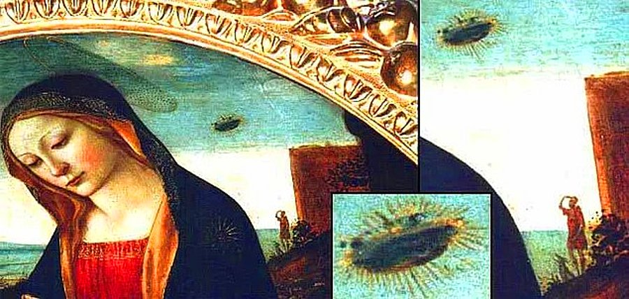 They are discus clouds that look unlike any normal cloud formation. They almost look like solid objects hovering in the air. Many religious paintings depict sacred objects in the atmosphere. Some are gold, others are silhouettes, but you can begin to see what would later be the hallmark shape we know now as U.F.O.s- though when people say that they don’t mean an unidentified flying object, they mean alien saucers.